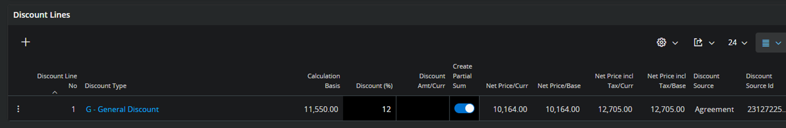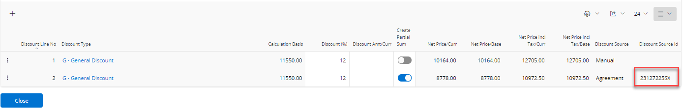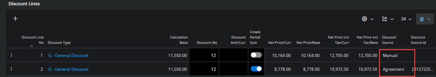 First, you add a line that has a general discount in the Customer agreement This will give you this lines, with discount source agreement