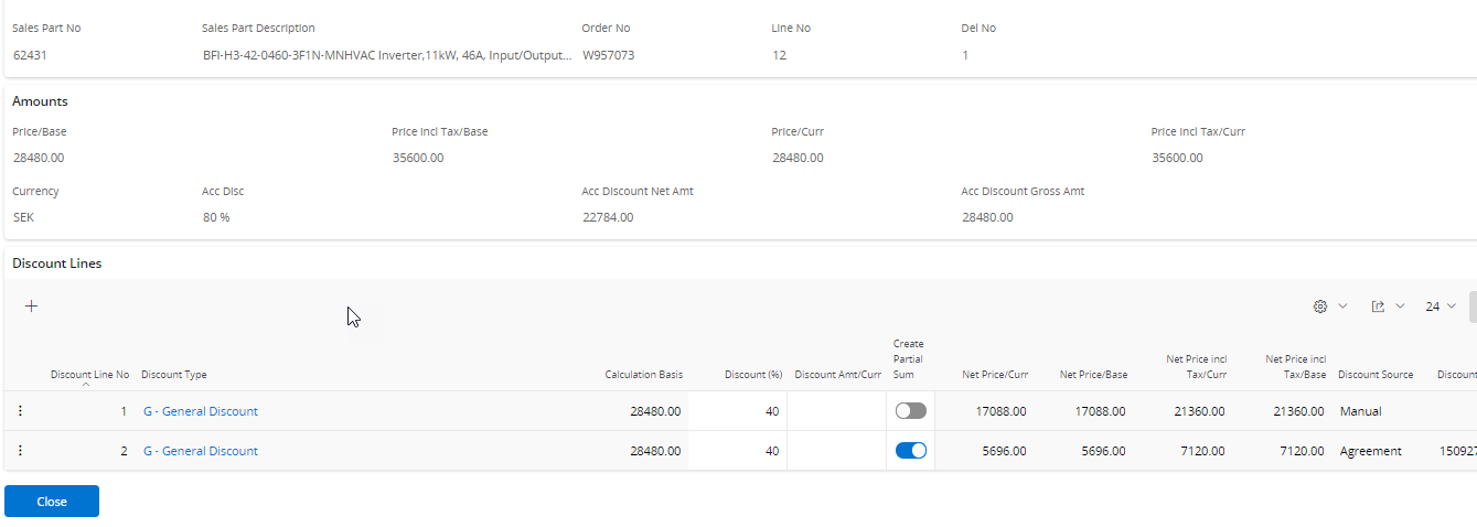 Jag tog samma order i TEST, W957039, och ändrade rad 11 från 2st till 3st och då blev det 80% rabatt istället för 40%